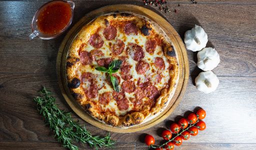 mit Schinken, Speck, Knoblauch, Tabasco, scharfer Pfefferoni und Zwiebeln